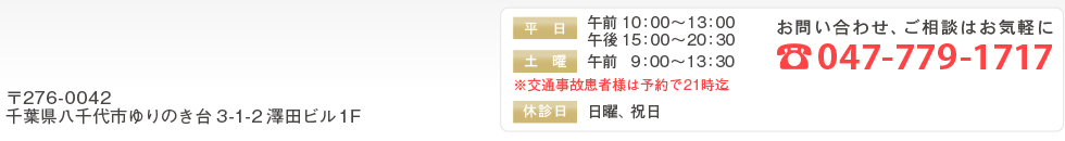 当院は厚生労働省認可の国家資格を有したスタッフが「肩のコリ・腰の痛み・膝の痛み」などはもちろん、スポーツをされている方におこるケガ(スポーツ障害)や、むち打ちなど交通事故によるケガの施術を行わせて頂いている千葉県八千代市・東葉高速鉄道 八千代中央駅前(徒歩10秒)にある整骨院です。